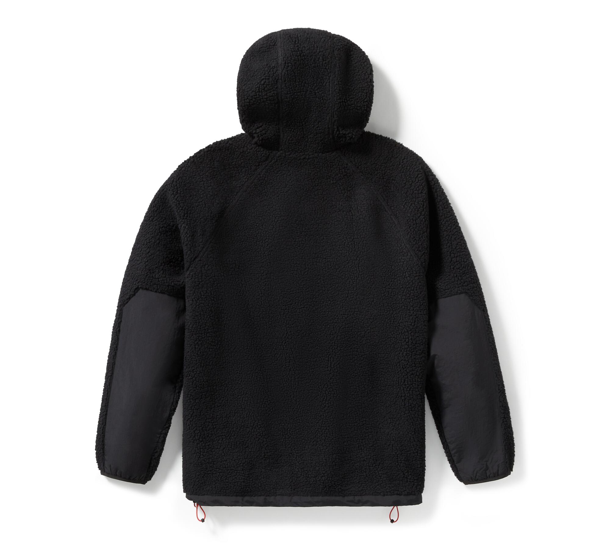 Comodità e fedeltà allo stile motociclistico sono gli elementi vincenti di questa felpa con cerniera. È realizzata in sherpa di poliestere pesante con orlo, polsini e bordo del cappuccio elastici per conservare meglio il calore corporeo quando il freddo fuori si fa sentire. Questo capospalla da uomo si caratterizza inoltre per le ampie tasche e la composizione a contrasto sulle maniche per un look raffinato. Il branding è presente  con una versione ricamata dello stemma Bar & Shield sul davanti.