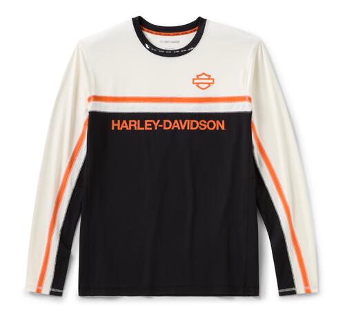 Prova un nuovo stile e un nuovo comfort con la nostra maglia a maniche lunghe H-D® TECH Color Block con aperture di ventilazione. Realizzata in un mix di jersey di poliestere ed elastan, offre comfort e freschezza grazie alle ascelle in rete, ai pannelli laterali e alle aperture di areazione sul pannello posteriore. Lo stile color-block e la stampa del marchio contemporaneo ad alta densità su entrambi i lati donano un look raffinato.