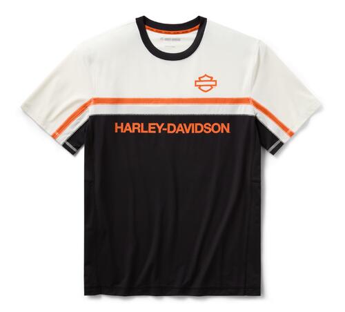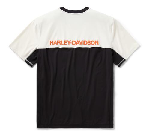 Migliora la tua collezione di t-shirt con questo modello. Realizzata in un mix di jersey di poliestere ed elastan, la nostra maglietta areata H-D® TECH Color Block offre comfort e freschezza grazie alle aperture in rete sotto le ascelle, sui pannelli laterali e sul pannello posteriore. Lo stile color-block e la stampa del marchio contemporaneo ad alta densità su entrambi i lati donano un look raffinato.