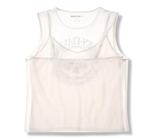 Top in rete con collo alto e giromanica bordati. Orlo dritto arrotolato. Canotta rimovibile con scollo bordato e laccetti regolabili. Taglio corto.