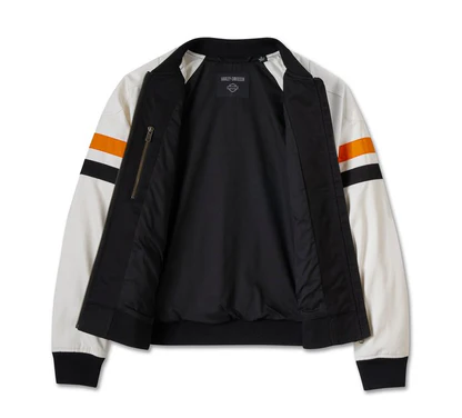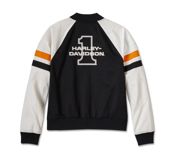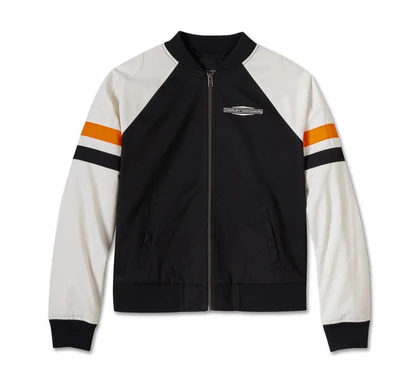 Giacca bomber Harley-Davidson® Stacked Bar & Shield da donna, nera e bianca. Realizzata in twill pesante 100% cotone. Fodera in twill 55% cotone, 45% poliestere. Cerniera frontale. Tasche scaldamani a filetto con chiusura a scatto nascosta. Tasca interna con cerniera. Maniche raglan a contrasto. Spalle e gomiti applicati nella parte superiore. Strisce applicate nella parte superiore sulle maniche. Colletto, polsini e vita a costine. Applicazione in twill ricamata con ricamo a punto raso. Ricamo diretto.